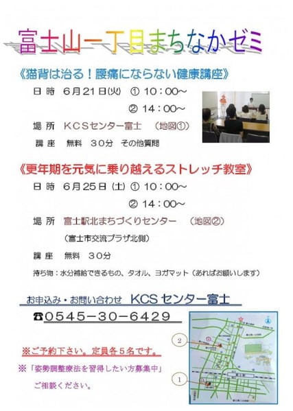 6/21(火)・6/25(土) KCSセンター富士のまちなかゼミが開催されます! 6/21(火) 「猫背はなおる!腰痛にならない健康講座」(まちなかゼミ10番) 時間:①10:00~/②14:00~の二回開催 場所:KCSセンター富士 予約はお電話にて 定員:5名 参加費:無料 6/25(土)「更年期を乗り越えるストレッチ教室」(まちなかゼミ13番) 時間:①10:00~/②14:00~の二回開催...