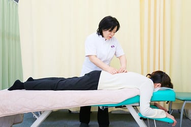 うつ伏せになり、洋服の上から背中の柱、脊柱の歪みを手でゆがみをチェックします。